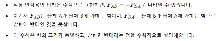 - 이 원리는 힘이 항상 쌍으로 존재한다는 사실을 강조하며, 모든 물체가 상호작용하고 있다는 것을 보여줍니다.