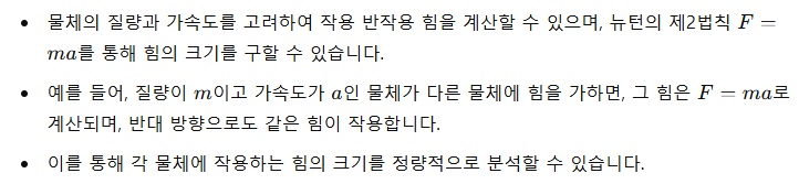 - 작용과 반작용은 항상 동시에 발생하며, 서로의 크기가 동일하고 방향이 반대입니다.