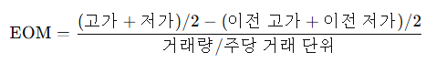 - 가격이 적은 거래량으로도 쉽게 움직인다면 EOM 값이 높고, 많은 거래량이 필요하다면 EOM 값이 낮습니다.