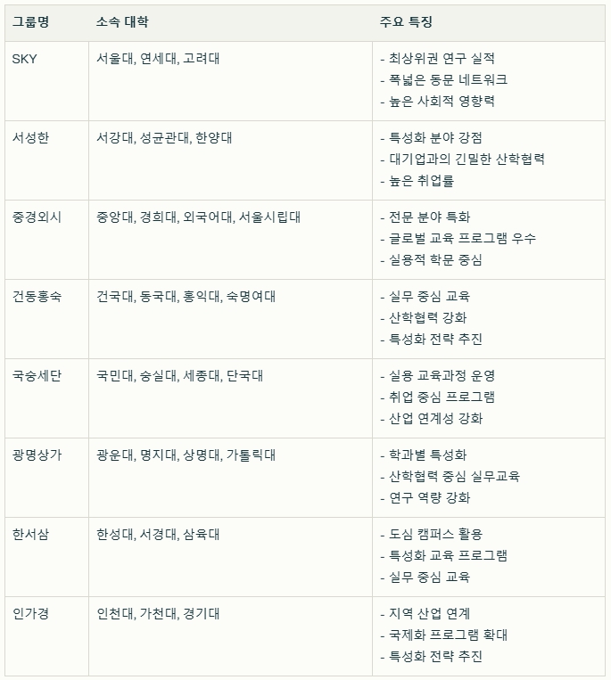 대학 입시를 준비하는 수험생과 학부모님들을 위해 국내 주요 대학들의 그룹별 특징과 현황을 정리했습니다. 한국에서 대학 순위나 입시 평가와 관련해 흔히 사용되는 SKY, 서성한, 중경외시, 건동홍숙, 국숭세단, 광명상가, 한서삼, 인가경은 각각의 대학 이름의 앞 글자를 따와 만든 약칭입니다. 이러한 이름은 학생, 학부모, 입시 전문가들 사이에서 널리 사용되며 대학 평가와 선호도를 간접적으로 보여주는 표현으로 자리 잡았습니다.